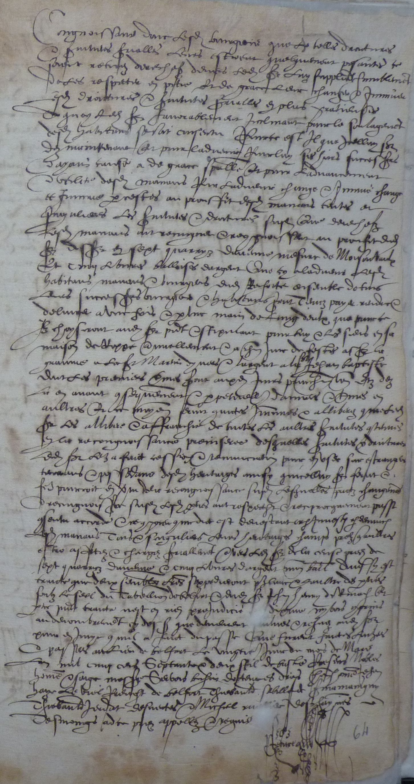- Après une introduction présentant les parties présentes lors de la passation de l'acte de 1572 (habitants de la communauté de Rechotte et Jean Henry de Reinach, leur seigneur), le texte incorpore la transcription d'un dénombrement et reconnaissance des droitures fait le 23 avril 1554.