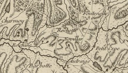 ce qu'ilz ont & tiennent d'heritaige gysant au maigny dud. Rechottes & deans les quatres cors & territoires dicelluy tant en champs, prelz, oiches, chesaulx, curtilz, terres aribles & non aribles que tous aultres heritaiges soient tant aud. Rechottes de la paroisse dud. Novillers qu'aultrepart quilz le tieignent & est du propre & vray heritaige dud. Sr. Jehan henry etc. et sont tousjours tenu lesd. declairans dud. Sgr. & ses antecesseurs jusques au pnt. |