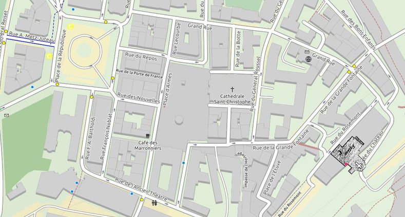 Reconstitution de la position de l'ancienne collégiale Saint-Denis (à l'emplacement de la cour de l'actuelle école Jules-Heidet). La chapelle Saint-Sébastien