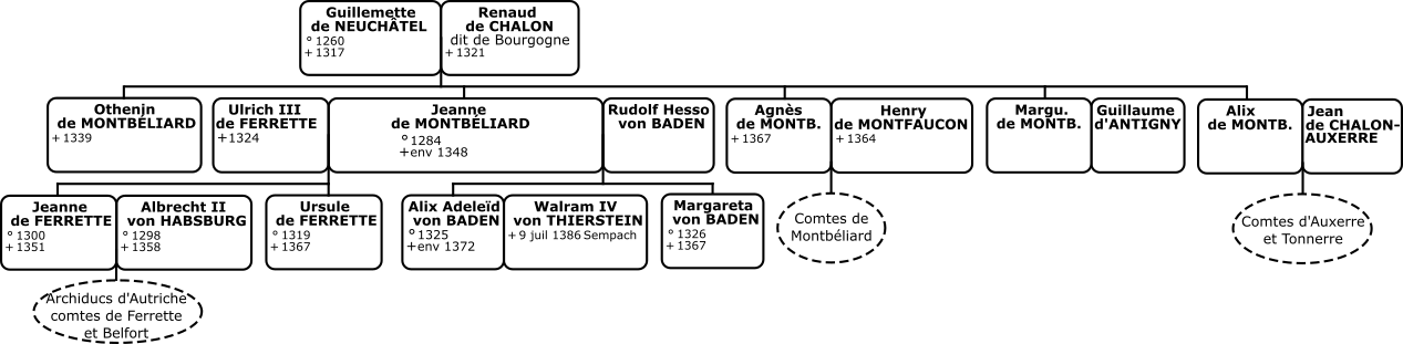 Renaud de Chalon, dit de Bourgogne, hérite parallèlement du comté de Montbéliard par son mariage avec Guillemette, petite-nièce de Marguerite de Moutfaucon.