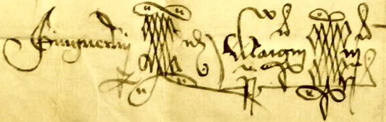 La teneur de l'acte original prend fin à la ligne 14 ; suit la mention du copiste. Le parchemin est superbement paraphé par Fingerlin / Finguerlin et Maingnin :