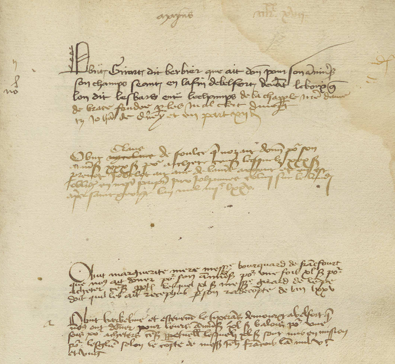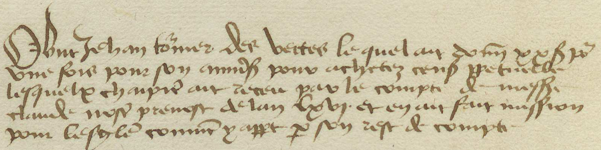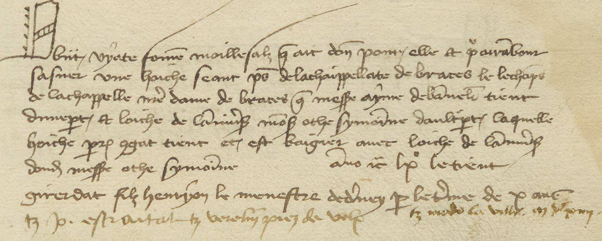 Dans le suivant, c'est messire Jehan Henry frere doudit Vuillaume Marcoulz. Ici, Marcoulz apparaît d'avantage comme un proto-patronyme (le clerc a sans doute recopié à l'identique le contenu des écrits dont il disposait).