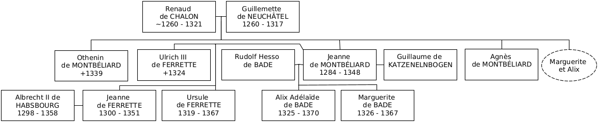Jeanne de Montbéliard : fille de Renaud de Chalon, dit de Bourgogne (3), et de Guillemette de Neufchâtel-en-Bourgogne, comtesse de Montbéliard et Belfort. Elle fut la veuve d’Ulrich III, dernier comte de Ferrette (avant les Habsbourg) -lointainement apparenté aux Montbéliard-.