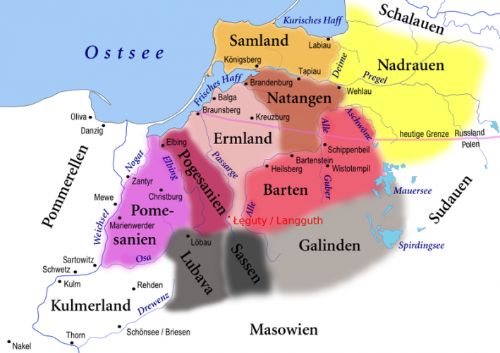 | La Prusse-Orientale au XIIIe siècle, avec toponymes allemands, CC BY-SA 3.0, via Wikipedia |