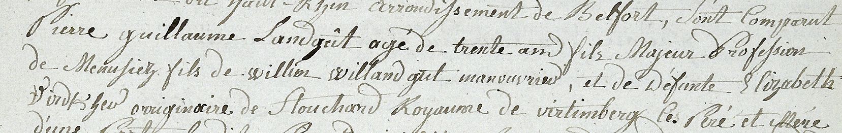 À Montbouton (Territoire de Belfort), le 5 octobre 1816, le scribe semble avoir eu bien du mal à comprendre et orthographier ce que lui a dit l’époux, lorsqu’il rédigea l’acte de mariage de Madeleine BOIGEOL avec «Pierre guillaume Landgût fils majeur de willim willandgut et de défunte Elizabeth Virdkher originaire de Stouchard Royaume de virtimberg (2)». Ne signant pas, l’époux ne précise pas l’information. Lequel du père ou du fils était originaire du Wurtemberg ? Origine non surprenante quand on sait que récemment encore le Comté de Montbéliard appartenait au Wurtemberg. Mais Stouchard ? Stuttgart ? Ou une localité à consonance semblable ?