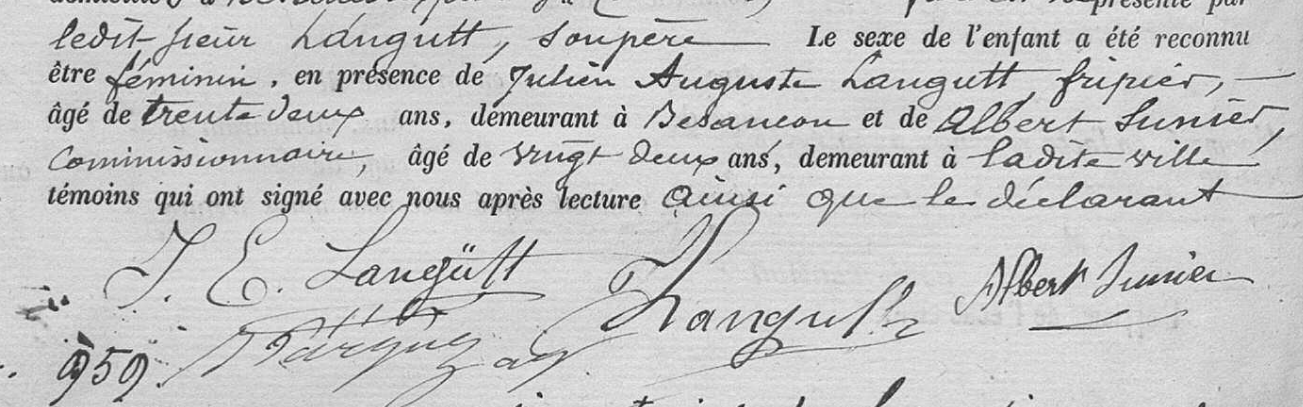 Julien Auguste LANGOUTTE ° 23/10/1848 L’Isle-sur-le-Doubs (25), X 10/10/1877 Besançon (25) Célestine Lisa JOYARD