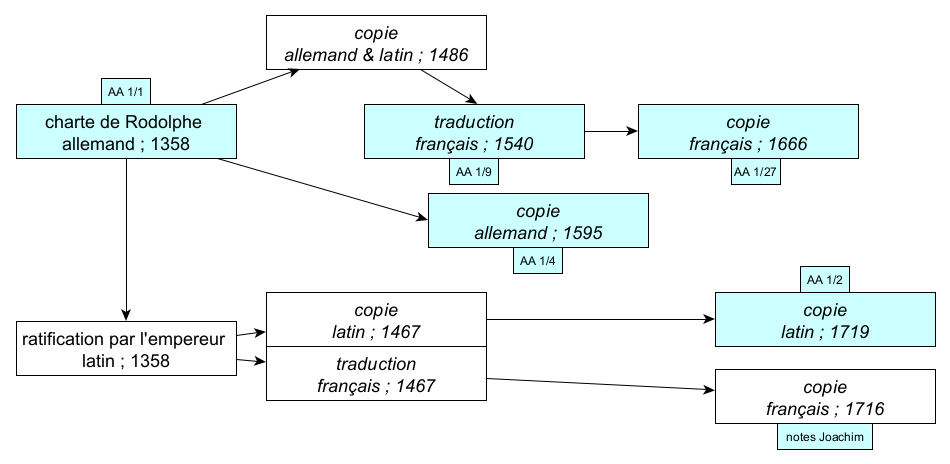 - par l'empereur Maximilien en 1511, confirmation de la franchise du droit de péage, copie (AA1/4), traduction en 1666 (AA1/27).