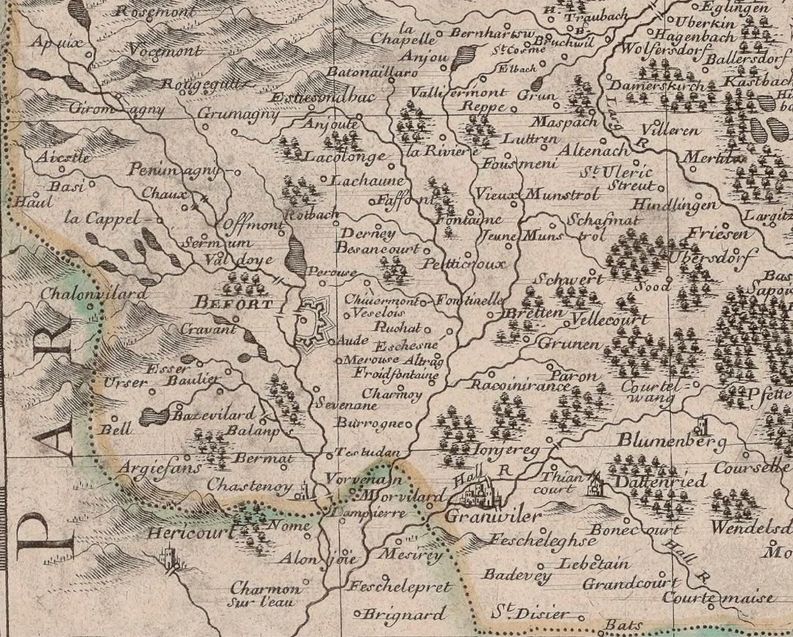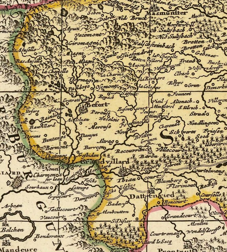 Pourtant, Sebastian Münster, géographe allemand (1488-1552), quand il dessine l'Alsace, néglige systématiquement l'essentiel de la région de Belfort, mentionnant tout au plus Delle, Florimont, et parfois, comme ci-dessous, Grandvillars :
