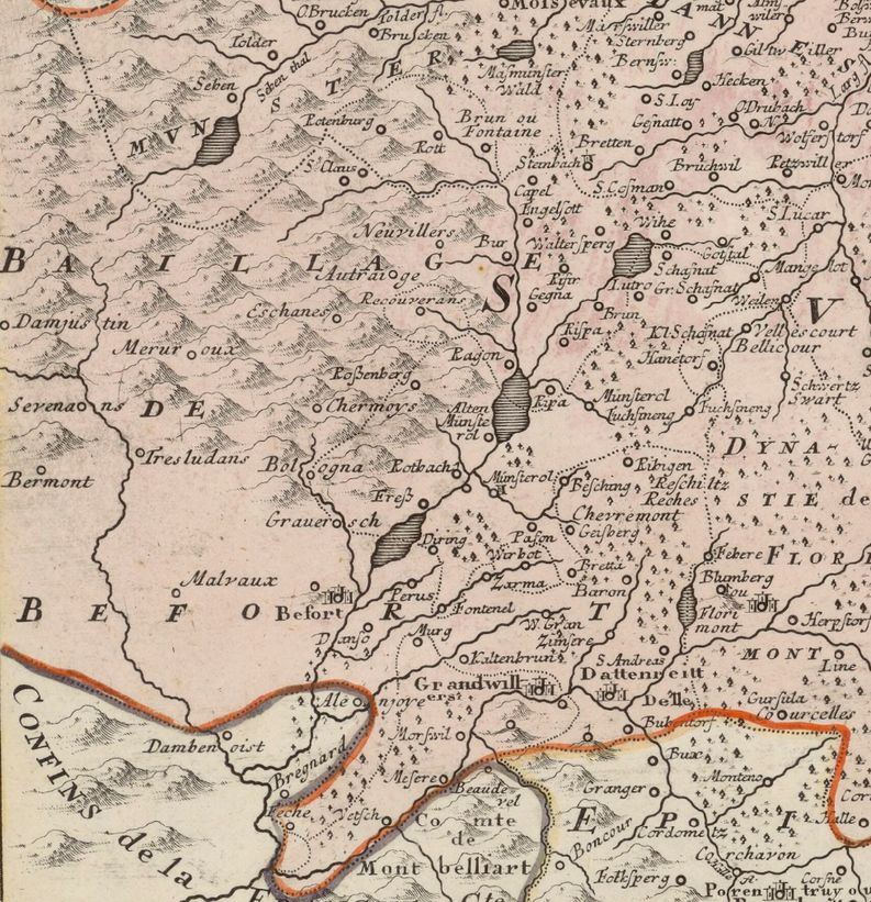 Représentation du relief. On notera entre autre les "monts de Sultan", à rapprocher de la mine "Soldan" à Lepuix, localité appelée en allemand Soda im Dorff. Cf. notre présentation du 3E 773