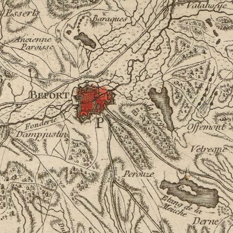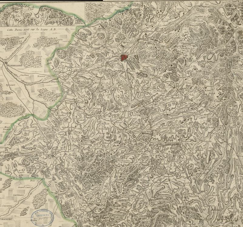 On y aussi voit une route, de Montbéliard à Bâle, passant par Delle, Faverois et Courtelevant. C'est l'ancêtre de la D463.