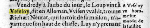 Voici des extraits de l'histoire de ce loup, dépeinte en 1591 par Jean Bauhin (originaire de Bâle) "Histoire notable de la rage des loups, avenue en 1590, avec les remèdes contre la rage causée par la morsure des bêtes enragées".Nous nous limitons au (funeste) périple de l'animal. Le lecteur intéressé pourra trouver intégralité du texte (avec les descriptions des blessures infligées et des soins dispensés, qui constituent la finalité de l'ouvrage) ici.