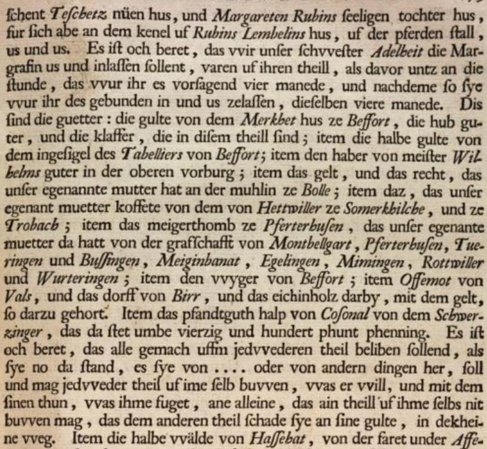 Voici en quoi consistent ces biens : les censes de la halle de Belfort, les fiefs héréditaires et les localités mineuressi Klaffer est une faute d'orthographe, pour Kaff(er) qui se trouvent dans cette part, item la moitié des revenus du sceau du tabellionné de Belfort, ainsi que l'avoine [sic] des biens de Me. Guillaume dans le faubourg supérieur, item les revenus et le droit que notre susdite mère à sur le moulin de BourogneBolle, item ce que notre susdite mère avait acquis du sire de Hettwiller à Sommerkhilche et à Traubach, item la mairie de Pérouse que notre mère y tient du comté de Montbéliard, de Pérouse, Dorans et Bessoncourt, Meiginhanat, Eguenigue, MenoncourtMimingen possiblement pour Müningen, RottwillerRougegoutte ? et Vétrigne, item l'étang de Belfort, item Offemont du Val et le village de BucBirr avec la chênaie et les revenus y afférents. Item la moitié du bien gagé de Cosonal à Suarce Schwerzinger, qui vaut 140 livres de pfennig.