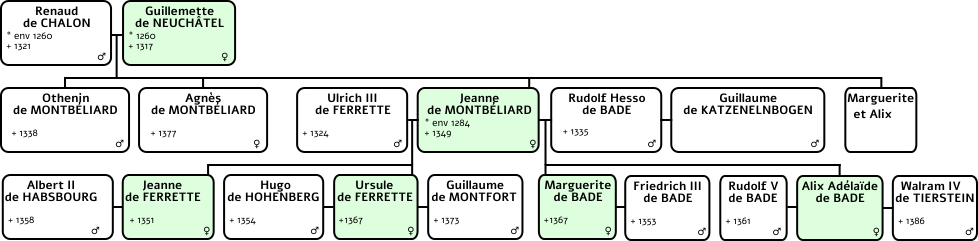 Voici un rappel généalogique des comtes et comtesses de Montbéliard au début du XIVe siècle (en couleur, héritières du comté de Belfort en totalité ou en partie) :