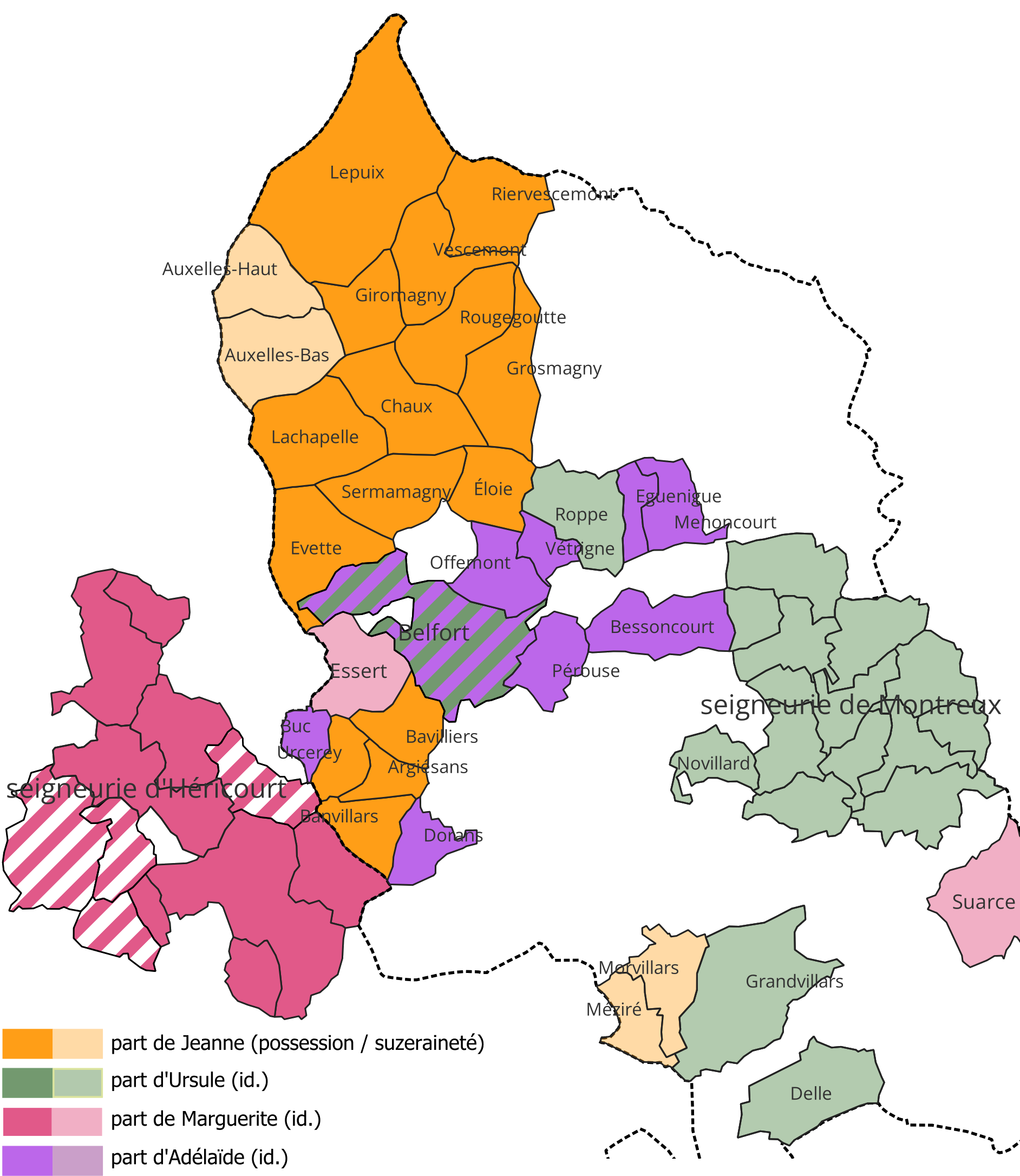 Les villages de Valdoie et Cravanche, par exemple, ont probablement été attribués à l'une des sœurs, mais ils ne sont pas reconnaissables dans les descriptions de fiefs.