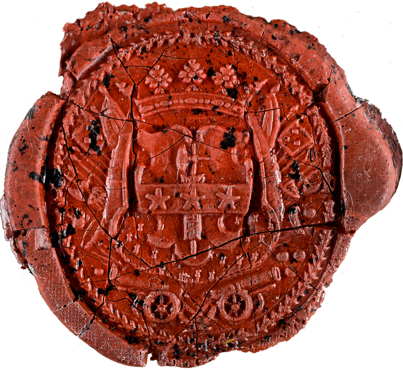 L'écu est le même que celui de son père Jean (2-1-1), sans les colliers des ordres royaux (sceau : 30 x 34 mm) :