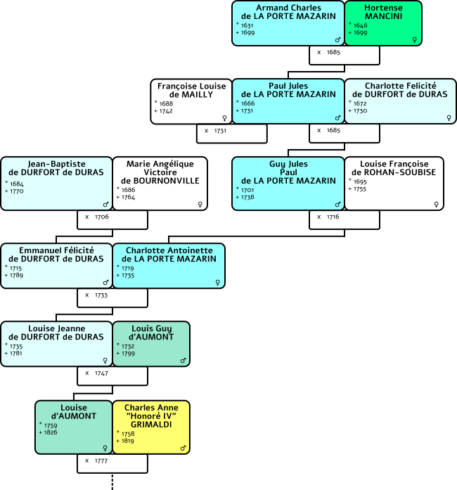 En 1777, Louise d'Aumont, enfant unique de Louise Jeanne de Duras et Louis Guy d'Aumont (voir l'arbre), épouse Charles Anne "Honoré IV" Grimaldi, qui deviendra à la mort de son père (Honoré III) duc de Valentinois et prince souverain de Monaco.