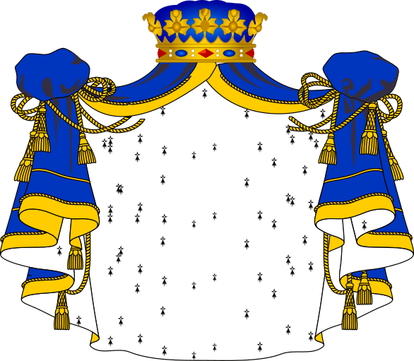 Dans les deux cas, le ou les écus sont entourés par le manteau de pairie, "de couleur blanche, semé de mouchetures d’hermine noires, doublé et bordé d’azur (bleu), rehaussé de franges et glands dorés".