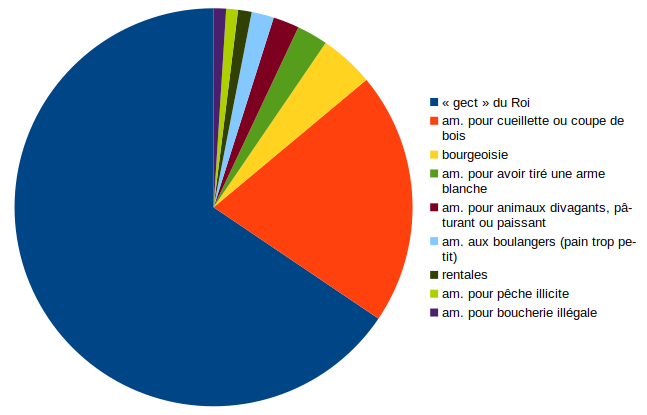 Les amendes infligées par les banvards, entre 4 et 10 sols l'une, induisent le plus grand nombre d'articles, mais représentent une part modeste de l'ensemble, à peu près équivalente aux censes. Le produit des ventes est évidemment très variable.