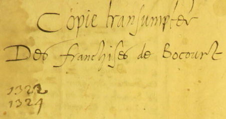Les deux dates attirent évidemment notre attention : ce sont celles du dossier A, auquel le copiste a très probablement voulu relier cet acte. Les familles Gressard et Pyon apparaissent donc comme descendantes ou, du moins, héritières des bénéficiaires de ces franchises. Pour établir leur droit, elles ont présenté le document original (la lettre de franchises), qu'on suppose transmis soigneusement de génération en génération.