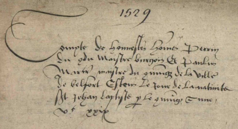 Le premier, chronologiquement (mais qui apparaît en second dans l'archive en ligne) débute classiquement par l'installation du nouveau maître bourgeois, Perrin Du Condu (Du Conduit), à la Saint-Jean-Baptiste 1529 :