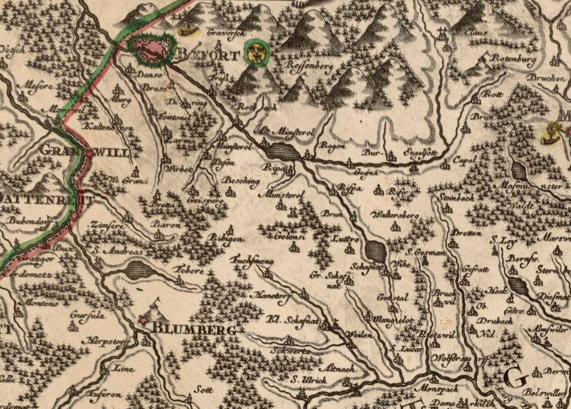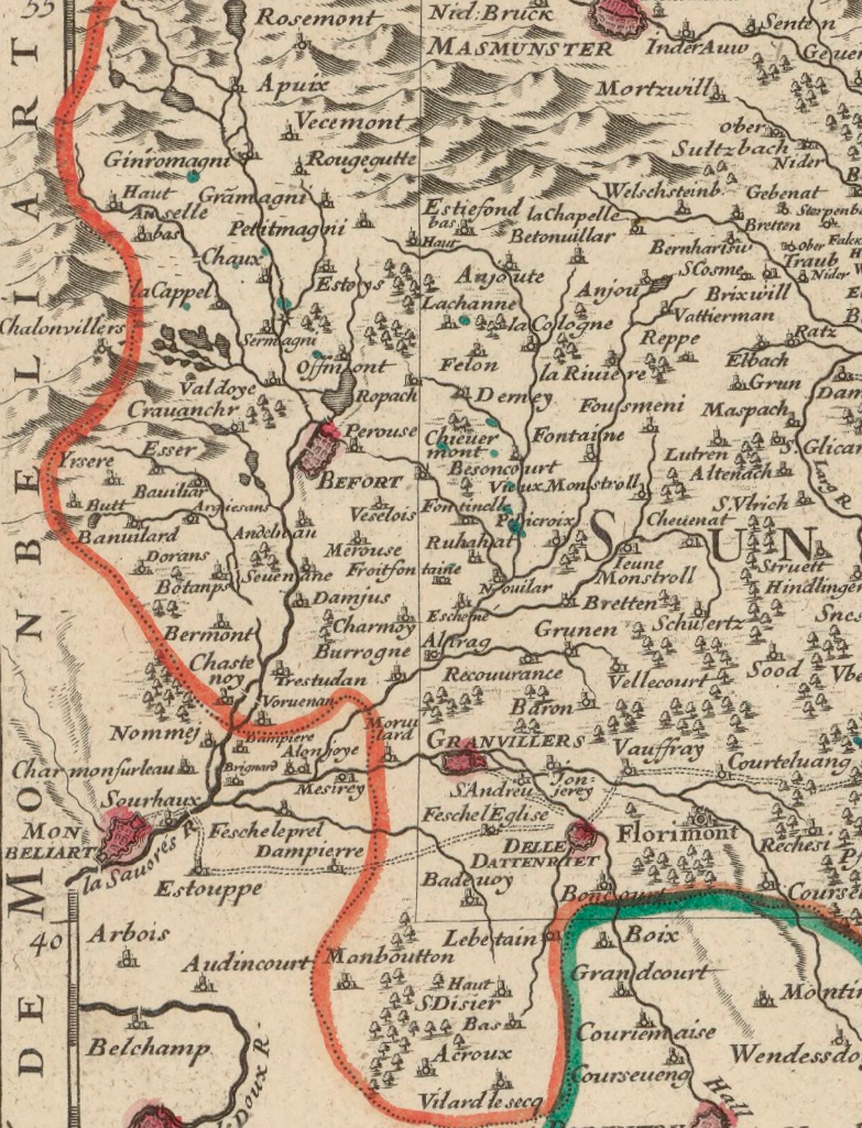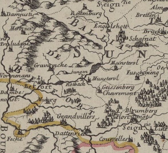 Pourtant, Sebastian Münster, géographe allemand (1488-1552), quand il dessine l'Alsace, néglige systématiquement l'essentiel de la région de Belfort, mentionnant tout au plus Delle, Florimont, et parfois, comme ci-dessous, Grandvillars :