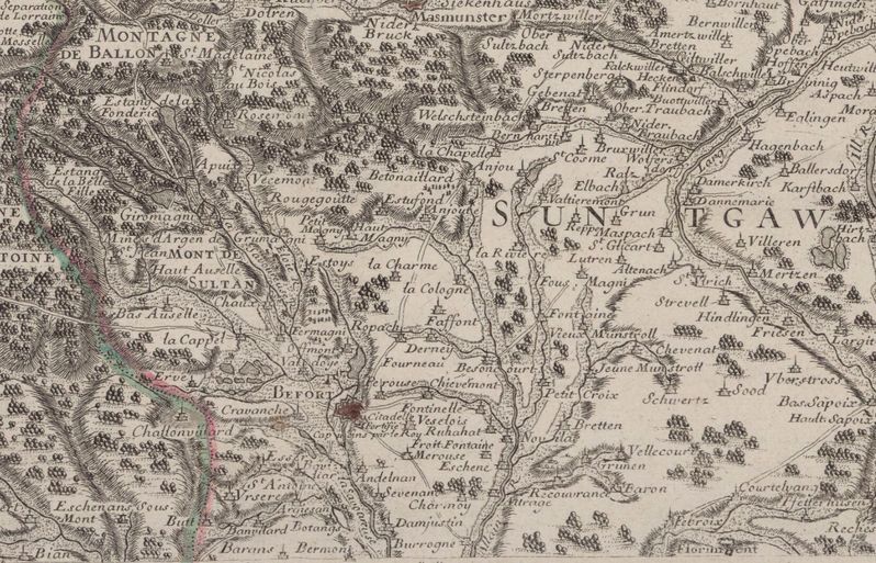 Représentation du relief. On notera entre autre les "monts de Sultan", à rapprocher de la mine "Soldan" à Lepuix, localité appelée en allemand Soda im Dorff. Cf. notre présentation du 3E 773