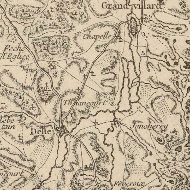 On y aussi voit une route, de Montbéliard à Bâle, passant par Delle, Faverois et Courtelevant. C'est l'ancêtre de la D463.
