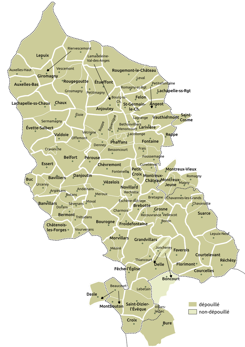 Sont représentées : les paroisses du département + les paroisses dont relèvent certaines communes frontalières + Montreux-Vieux.