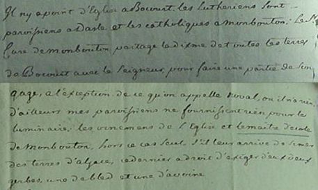 | Sous l'Ancien Régime, les sujets luthériens relèvent de la paroisse de Vandoncourt, et plus précisément de sa filiale de Dasle. Les sujets catholiques relèvent de celle de Montbouton. | ||