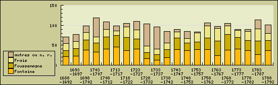 | BOURQUARD | 1688 | 1793 | BOURQUARDÉ | 1687 | 1792 | FROIDEVAUX | 1688 | 1791 | ROSSÉ | 1686 | 1792 | RICHARD | 1687 | 1792 | CHAGUEZ | 1686 | 1792 | BAUME | 1686 | 1787 | CREMPET | 1700 | 1792 | HARTEMAN | 1687 | 1791 | BEUDAT | 1688 | 1792 | FELTIN | 1695 | 1792 | POIRE | 1690 | 1791 | HERBELIN | 1687 | 1792 | CHOFFAT | 1708 | 1791 |
