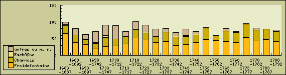 | MAIRE | 1683 | 1791 | COUCHOT | 1730 | 1792 | CHETELAT | 1695 | 1791 | GESTE | 1688 | 1792 | CHOQUARD | 1685 | 1791 | MARCHAND | 1683 | 1780 | FENNIER | 1702 | 1789 | GIROL | 1682 | 1774 | MONNIER | 1693 | 1791 | VOIDIN | 1684 | 1782 |