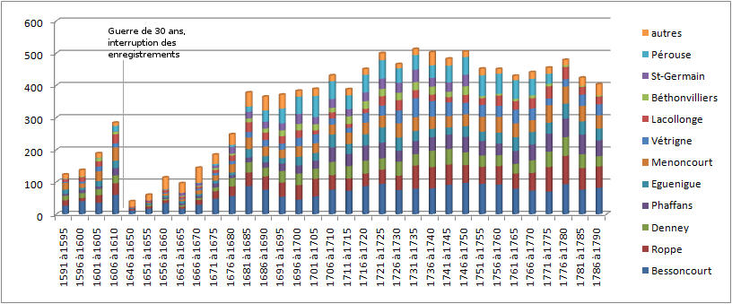 Pour la "grande" paroisse de Phaffans (la plus grande du département à la fin de l'ancien régime), les statistiques montrent évidemment la catastrophe démographique de la guerre de 30 ans (populations décimées et exilées, absence de curé, donc de sacrements et de registres) : les baptêmes ne retrouvent leur niveau antérieur que 35 ans après la fin de la guerre :