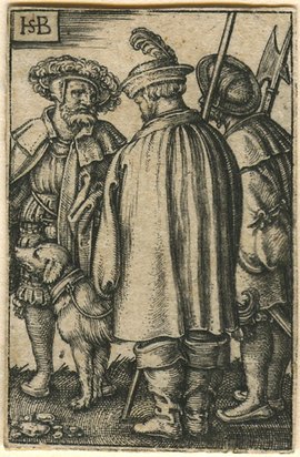 | "Trois soldats et un chien", de Hans Sebald (1500-1550) On y voit un piquier et un hallebardier. | Trois Doppelsöldner : de côtés, munis de piques ; au centre, d'une arquebuse et de sa fourquine ; d'après Jacques de Gheyn (vers 1600) |